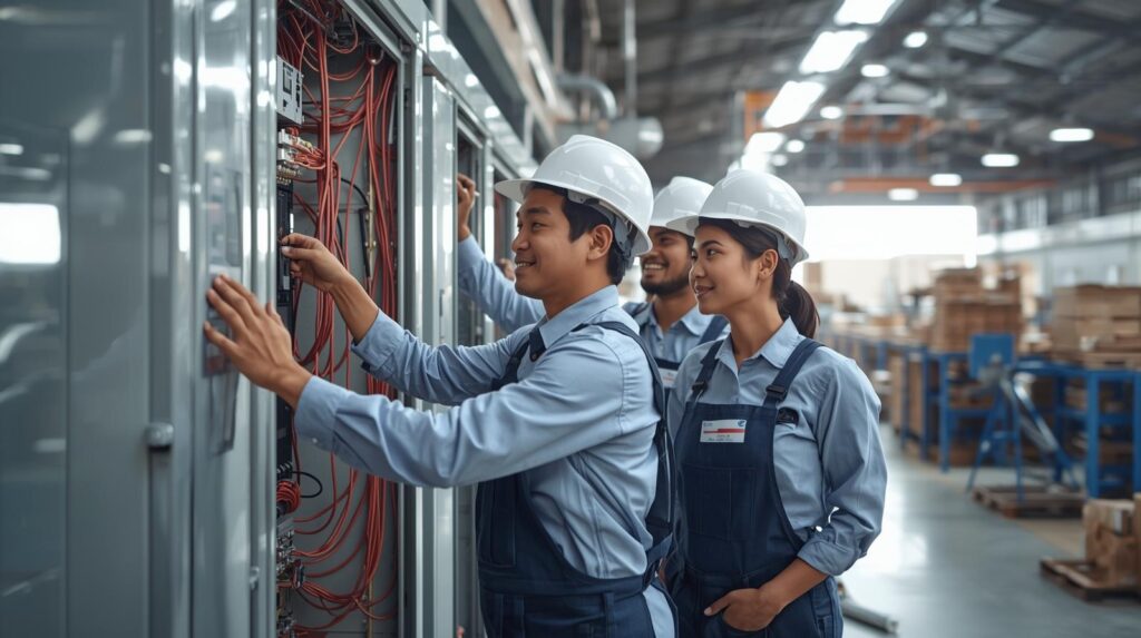 Jasa instalasi panel listrik memiliki peran vital dalam mendukung operasional pabrik. Peran utama mereka antara lain: merancang panel listrik sesuai kebutuhan industri, memasang Main Distribution Board (MDB) dan Sub Distribution Panel (SDP), menyediakan Motor Control Center (MCC) untuk mengatur motor listrik industri, memastikan sistem grounding berfungsi baik, serta melakukan perawatan berkala untuk menjaga panel tetap prima. Dengan dukungan tukang listrik industri yang profesional, operasional pabrik bisa berjalan tanpa hambatan.
